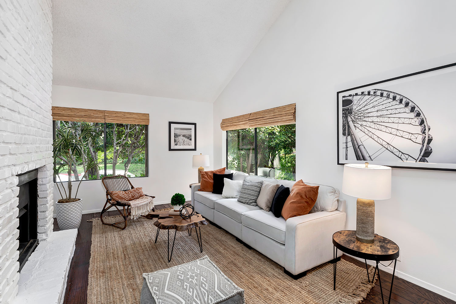 2 Beds + 2 Baths + additional bonus room/office. Open floor plan, ideal for entertaining. Light & bright living room and entryway with dramatic cathedral ceilings, skylight, gas fireplace, hardwood floors in the step down living room, dining room & master bedroom. Lots of large windows throughout with serene views of mature trees. Formal dining room off kitchen with large window providing loads of natural light. Gorgeous, bright eat-in kitchen w/ large picture windows. Newly painted interior walls and cabinets throughout. Huge master suite w/ vaulted ceilings, double closet mirrored doors. Private 2-car garage with direct access. Massive attic space waiting to be converted into a finished studio/office.